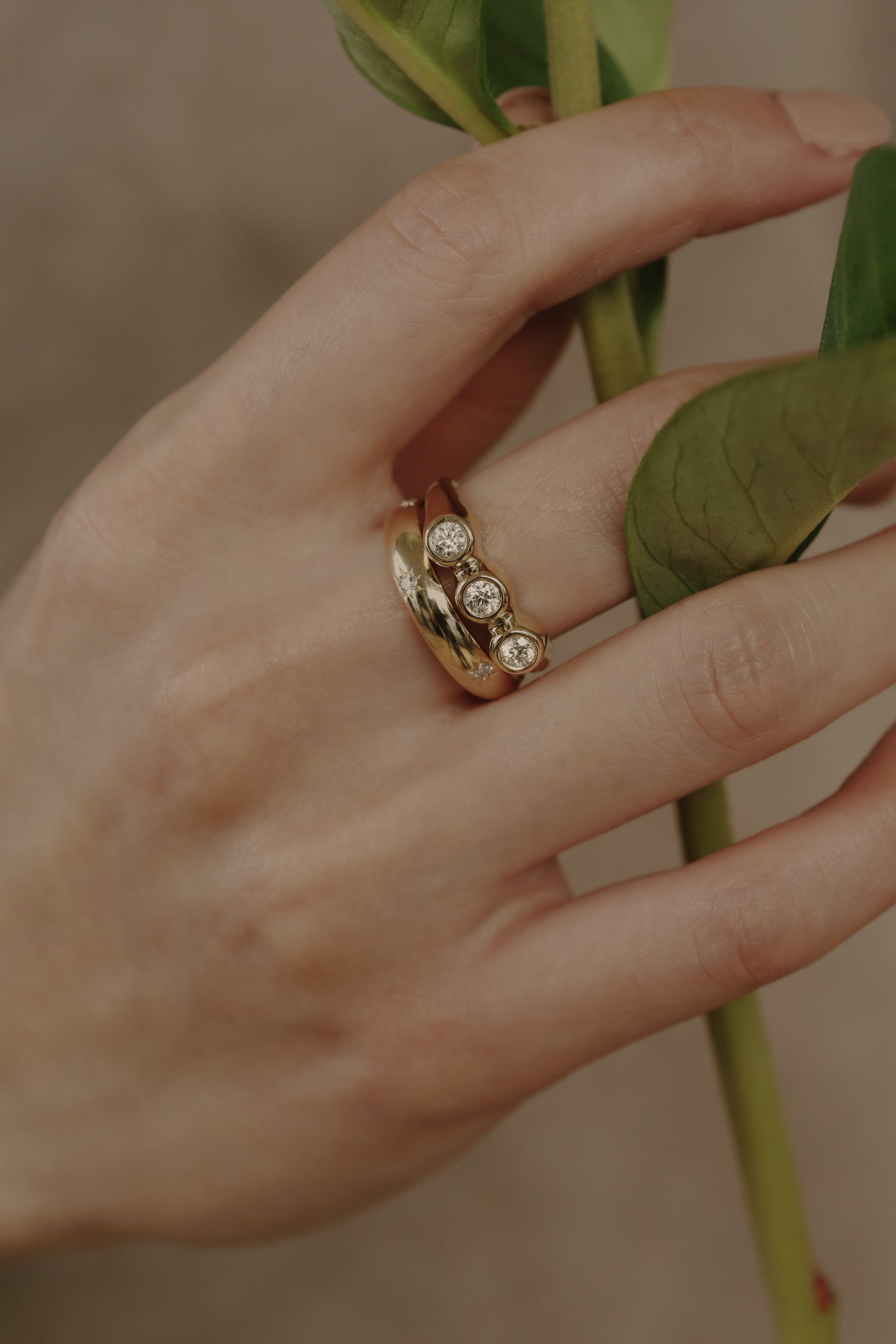 An organic and soft signet style ring that highlights the 3 bezel set diamonds. A marriage of timeless beauty and strength for any occasion.